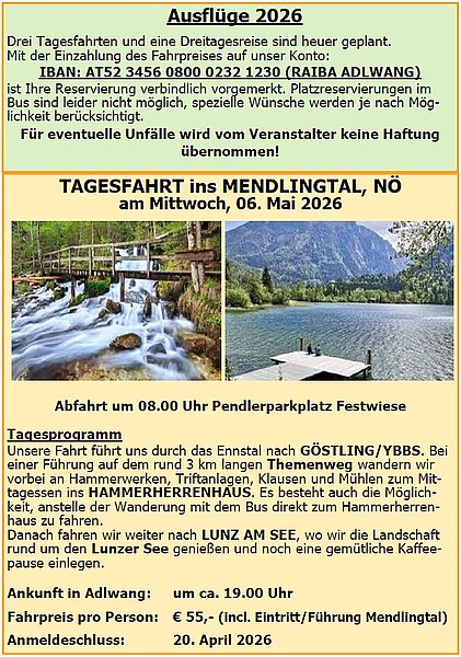 TAGESFAHRT ins MENDLINGTAL, NÖ